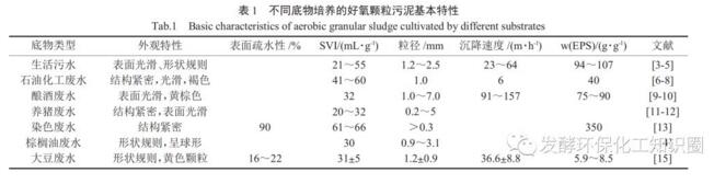 好氧顆粒污泥是結構緊密、沉降優(yōu)良的微生物聚集體。好氧顆粒污泥多為黃褐色或白色,成熟的顆粒污泥表面光滑,形狀規(guī)則,多為球形或橢球形。通常地,好氧顆粒污泥的粒徑在0.2~7.0mm。受氧氣傳質的影響,顆粒污泥存在好氧區(qū)、兼性厭氧和厭氧區(qū)。好氧、兼性及厭氧微生物廣泛存在,相互協同,強化了污染物的處理效果。好氧顆粒污泥具有突出的沉降性能,污泥指數(SVI)約20~68mL/g,沉降速度為6~157m/h??紫堵屎涂箟簷C械強度分別為68%~93%和0.16~0.42N/mm2。顆粒污泥的特性受接種污泥、進水pH、曝氣強度及底物類型等多種因素影響,而底物類型是影響顆粒污泥特性的主要因素。表1總結了不同底物類型培養(yǎng)的好氧顆粒污泥特性。與易降解廢水(生活污水、釀酒廢水和養(yǎng)豬廢水等)相比,難降解有機廢水(染色廢水、石油化工廢水)培養(yǎng)的顆粒污泥粒徑較小,結構更為緊密,生物活性更高。