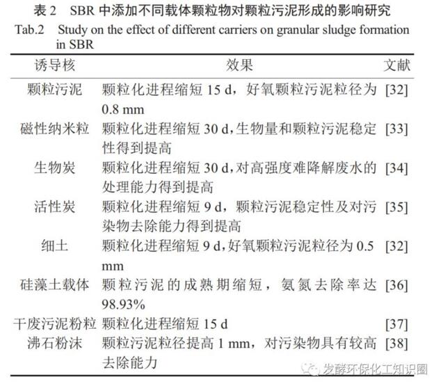 充當誘導核的物質種類較多,可以是微生物聚集體,非溶性無機鹽晶體,顆粒污泥或碎片等。通過人為投加顆粒載體,可加快污泥顆粒化的進程。一些學者通過向序批式活性污泥法反應器(SBR)投加生物碳、磁性納米粒、硅藻土等惰性載體,極大地促進了顆粒污泥的形成,詳見表2。然而,誘導核假說不能解釋顆粒污泥不存在核體的現象,存在一定的局限性。